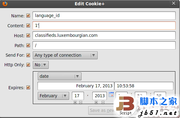 編輯目標(biāo)網(wǎng)站的cookie,來驗(yàn)證目標(biāo)網(wǎng)站是否存在http頭的SQL注入,我們編輯變量language_id的字段內(nèi)容,添加單引號(hào)’刷新頁面來判斷。
