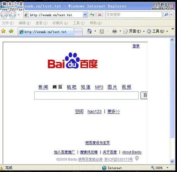 然后把test.txt上傳到web空間中,訪問一下,在框架中打開了百度.