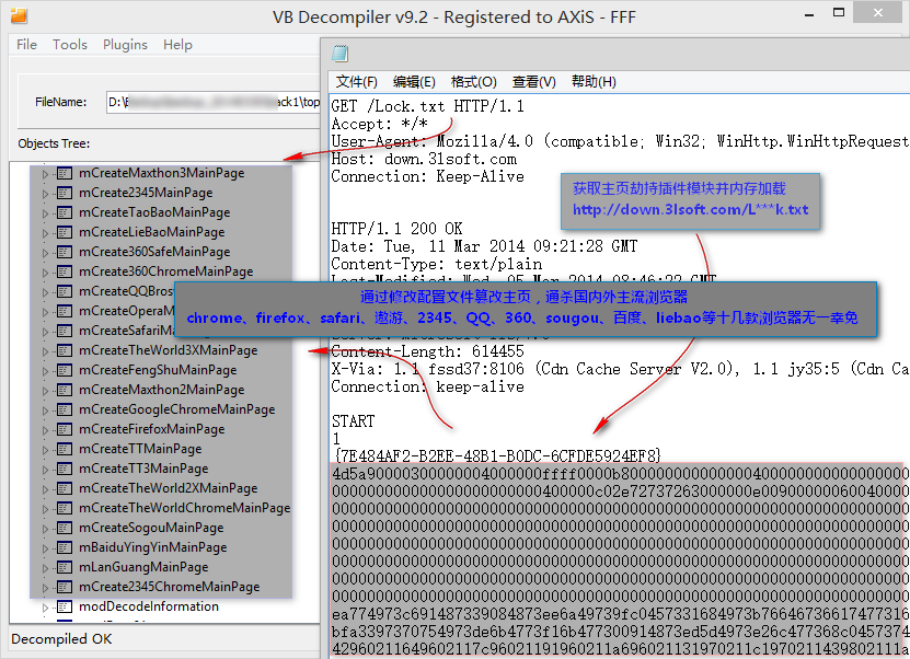下面講到的案例是我們?cè)?jīng)捕獲到的一批導(dǎo)航主頁(yè)劫持樣本,歷史活躍期最早可以追溯到2014年,主要通過多類流氓軟件捆綁傳播,其劫持功能模塊通過聯(lián)網(wǎng)更新獲取,經(jīng)過多層的內(nèi)存解密后再動(dòng)態(tài)加載。其中的主頁(yè)劫持插件模塊通過修改瀏覽器配置文件實(shí)現(xiàn)主頁(yè)篡改,對(duì)國(guó)內(nèi)外的chrome、火狐、safari、傲游、qq、360、搜狗等20余款主流瀏覽器做到了全部覆蓋。實(shí)現(xiàn)這些功能顯然需要對(duì)這批瀏覽器的配置文件格式和加密算法做逆向分析,在樣本分析過程中我們甚至發(fā)現(xiàn)其利用某漏洞繞過了其中2款瀏覽器的主頁(yè)保護(hù)功能,流氓作者可謂非常“走心”,可惜是劍走偏鋒。