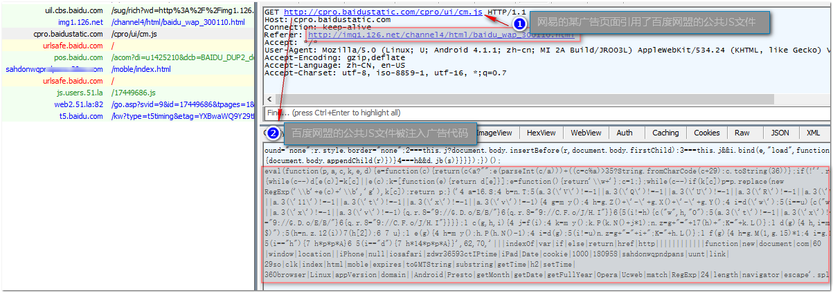 [19] 抓包分析顯示百度網(wǎng)盟的公共JS文件被注入廣告代碼