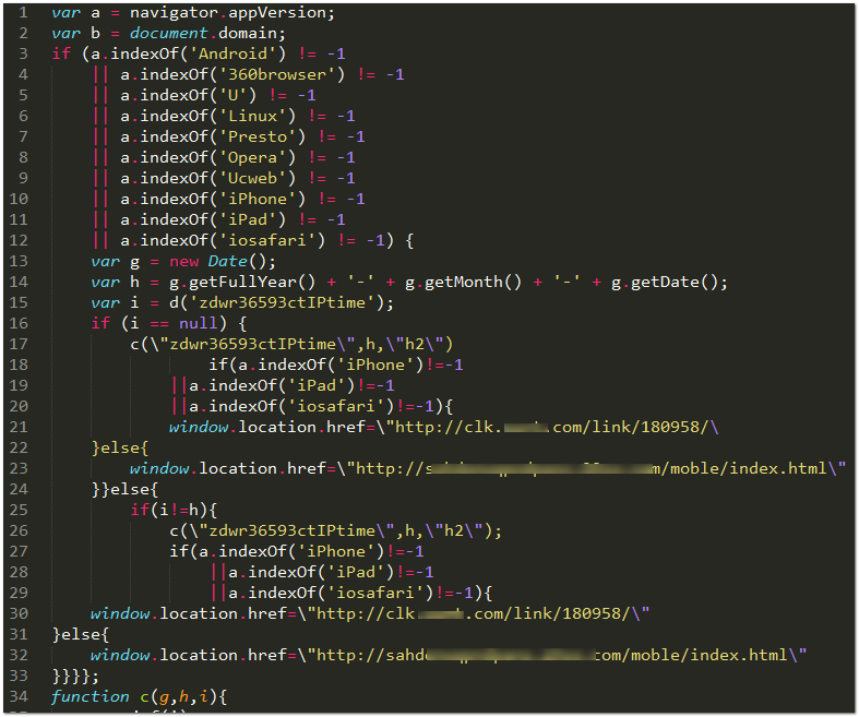 通過注入JS腳本來劫持用戶網(wǎng)頁(yè)瀏覽的技術(shù)優(yōu)點(diǎn)也很明顯,一方面注入的云端JS腳本比較靈活,可以隨時(shí)在云端控制修改劫持行為,另一方面對(duì)于普通用戶來說非常隱蔽,難以察覺。被注入用戶網(wǎng)頁(yè)的JS腳本的對(duì)網(wǎng)頁(yè)瀏覽中大部分的推廣流量都進(jìn)行了劫持,如下圖: