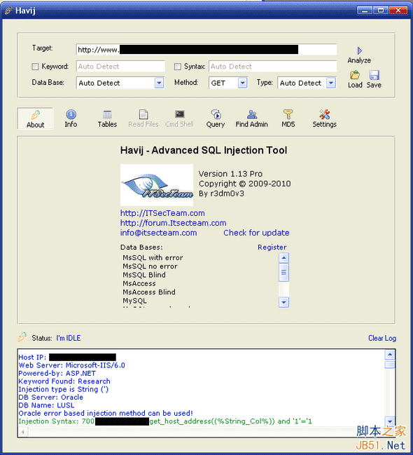 Havij是一款自動化的SQL注入工具,它能夠幫助滲透測試人員發(fā)現(xiàn)和利用Web應(yīng)用程序的SQL注入漏洞。Havij不僅能夠自動挖掘可利用的SQL 查詢,還能夠識別后臺數(shù)據(jù)庫類型、檢索數(shù)據(jù)的用戶名和密碼hash、轉(zhuǎn)儲表和列、從數(shù)據(jù)庫中提取數(shù)據(jù),甚至訪問底層文件系統(tǒng)和執(zhí)行系統(tǒng)命令,當(dāng)然前提是有 一個(gè)可利用的SQL注入漏洞。Havij支持廣泛的數(shù)據(jù)庫系統(tǒng),如 MsSQL, MySQL, MSAccess and Oracle。 Havij支持參數(shù)配置以躲避IDS,支持代理,后臺登陸地址掃描。