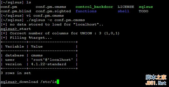 sqlsus是一個(gè)開放源代碼的MySQL注入和接管工具,sqlsus使用perl編寫并基于命令行界面。sqlsus可以獲取數(shù)據(jù)庫結(jié)構(gòu),注入你自己的SQL語句,從服務(wù)器下載文件,爬行web站點(diǎn)可寫目錄,上傳和控制后門,克隆數(shù)據(jù)庫等。