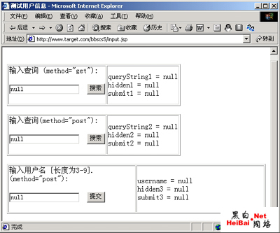 網(wǎng)頁(yè)對(duì)查詢窗體不會(huì)做任何輸入驗(yàn)證,但是對(duì)用戶名稱的窗體則會(huì)。將數(shù)據(jù)填入窗體,來(lái)測(cè)試一下網(wǎng)頁(yè)的漏洞,例子如下: