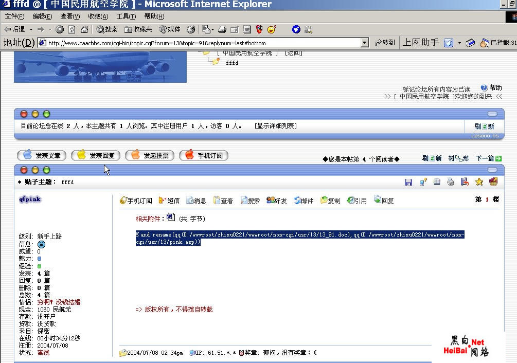 我們注冊一個q lcx的帳戶,然后再發(fā)一個內容為“ and rename(qq(你上傳的附件的物理路徑),qq(改名為你要的webshell的物理路徑))”,示例就如圖1那樣的方法。然后再瀏覽貼子,你就可以得到一個webshell了。在這里 為分隔符,q在這里是單引號的意思,qq當然是雙引號了,這樣一來q lcx…… 之間亂七八糟的內容就算是perl里有意義的東東了,這樣不會影響到后邊的rename函數的執(zhí)行。