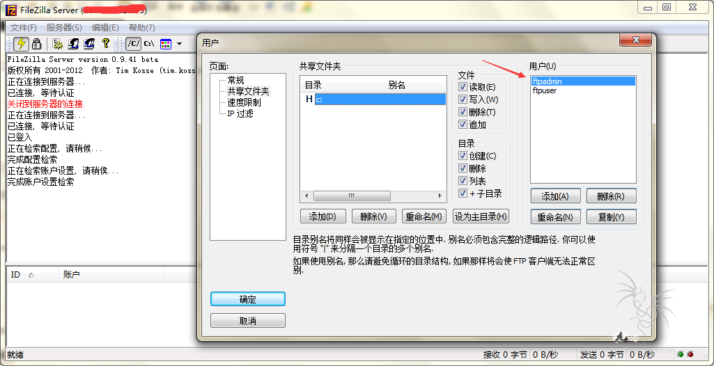 添加ftpadmin帳號C盤根目錄,給足權(quán)限。