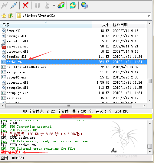 到這里的話,思路就是用這個FTP帳號去修改,system32下sethc.exe,然后5次shift你懂的。但是2008系統(tǒng)權(quán)限比2003嚴(yán)格一點(diǎn),導(dǎo)致系統(tǒng)文件是不能修改和刪除重命名,這里是沒有辦法利用: