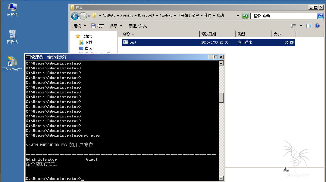 2.上傳利用到2008啟動項(xiàng) 目錄里,c:/users/administrator/appdata/roaming/microsoft/windows/start menu/programs/startup/