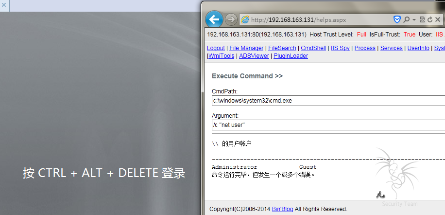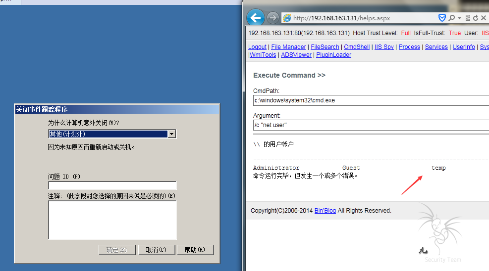 然后使用剛出來的webdav漏洞BSoD.exe使服務(wù)器藍(lán)屏重啟,重啟完以后成功添加帳號temp