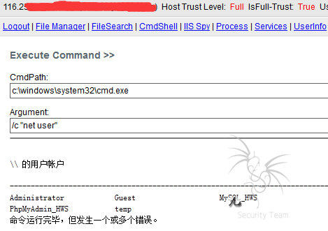 C盤根目錄無讀,D盤全盤瀏覽。mysql降權(quán)單獨(dú)用戶,sqlserver端口修改為1434,數(shù)據(jù)庫sa密碼不正確,也無法利用。