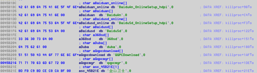 “第二代”病毒較前者去掉了病毒的更新功能,添加了“preservice.exe”用于結(jié)束一些主流安全軟件的安裝程序進程。由于病毒“入場”時間早于安全軟件,在與安全軟件對抗的時候大大降低的技術成本。如下圖: