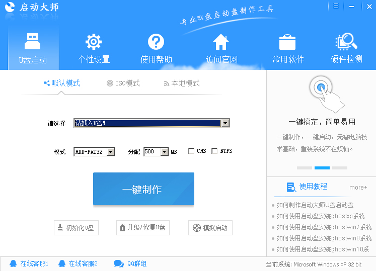 在用“啟動大師”制作了PE啟動盤后,我們進入了其預設好的PE系統(tǒng)。“啟動大師”運行效果圖如下: