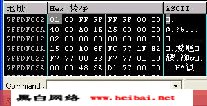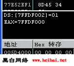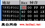 我們將以重啟ollydbg (ctrl F2)來結(jié)束第一步,到轉(zhuǎn)儲(chǔ)窗口(DUMP)單擊右鍵選擇"前往 表達(dá)" 7ffdf002或者其它任何先前你記下的地址,然后把它的值從01修改為00.