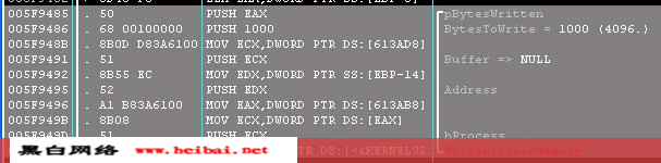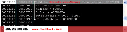 FTBirthday:由經(jīng)驗(yàn),我覺得很難走到這一步,但是我知道是在005F949E處call了WriteProcessMemory如圖: