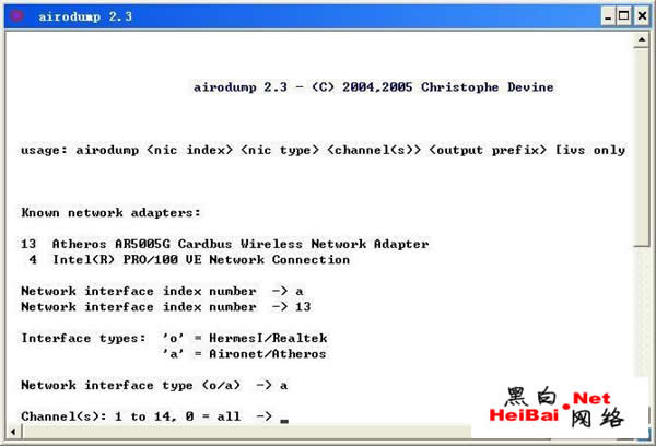 第五步:上篇文章中提到了筆者已經把無線網絡的SSID廣播功能取消了,這樣我們假設還不知道該無線設備使用的哪個頻段和SSID號。在這里輸入0,這樣將檢測所有頻段的無線數(shù)據(jù)包?!?