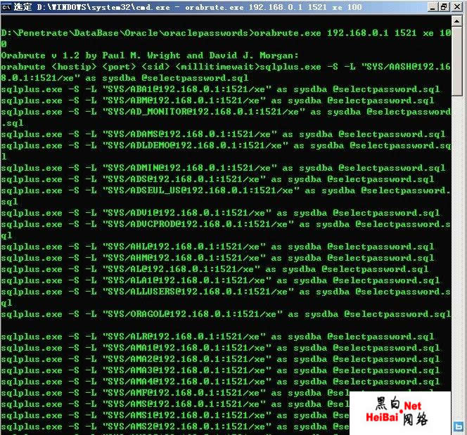 可以使用 Orabrute 工具來進行遠程破解,在使用這個工具的時候,需要系統(tǒng)提前安裝好 Sqlplus,該工具的 原理很簡單,就是不停的調(diào)用 Sqlplus 然后進行登錄驗證,帳戶選擇的是 SYS,密碼則為 password.txt 中的密 碼單詞。只要登錄成功 ,就會調(diào)用 selectpassword.sql 腳本抓取出在 SYS.USER$表中的其他用戶的哈希值 , 然后退出程序。這里有個注意的地方,當?shù)诙芜\行 Orabrute 的時候,需要刪除或移動同目錄下的前一次運行 Orabrute 時生成的 thepasswordsarehere .txt 和 output.txt 文件。