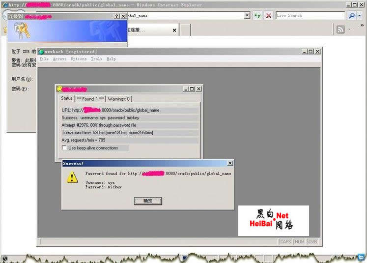 當我們訪問 http://ip:8080/oradb/public/global_name 時,會彈出認證信息,這種 HTTP 的基本驗證,有好 多的工具可以快速破解,可以選擇著名的 Hydra,我這里選擇的是圖形界面的 wwwhack,設置好用戶名為 SYS, 選擇字典,就可以破解了。速度要比通過 Orabrute 來破解快許多。效果如圖 6 所示