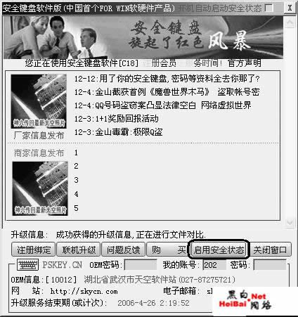 下面我們用安全鍵盤來對抗窗口鍵盤記錄器。安全鍵盤這款軟件使用特有的鍵盤安全技術(shù),以軟件的方式對Windows內(nèi)核和驅(qū)動內(nèi)核進行修改,以達到保護鍵盤安全的作用,防止重要信息被竊取。安全鍵盤具有一定的軟件保護功能。運行安全鍵盤后,點擊界面上的啟動安全狀態(tài)(如圖2),程序就進行保護狀態(tài)了,同時在系統(tǒng)托盤處生成一個“PK”圖標,雙擊它,在彈出的界面中點擊“開始”或“停止”按鈕即可快速切換鍵盤保護狀態(tài)(如圖3)?,F(xiàn)在運行窗口鍵盤記錄器,按照上面的方法做同樣的測試,最后發(fā)現(xiàn)窗口鍵盤記錄器記錄的文本內(nèi)容只有打開窗口的項目,而鍵盤輸入的內(nèi)容無法記錄,成功實現(xiàn)鍵盤輸入的加密。