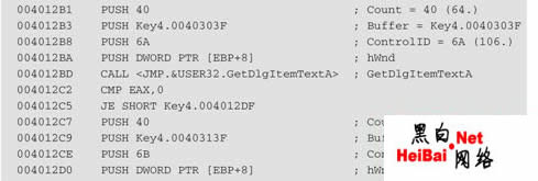 你第一個必須要完成的任務是定位這個crackme程序內的密鑰生成算法。可以采取的辦法有很多,但有一種方法很少會失敗,那就是尋找讀取你輸入用戶名和序列號的兩個文本框的那段代碼。假定KegenMe-3的主窗口是一個對話框(這一點通過查找程序初始化代碼中的創(chuàng)建對話框的API函數就可以很容易地得到證實),很可能程序會使用GetDlgItemText函數或者向文本框發(fā)送WM_GETTEXT消息。假定這個程序使用的是GetDlgItemText,你可以返回到OllyDbg的“Name(名稱)”窗口查找調用GetDlgItemTextA或調用GetDlgItemTextW的代碼。不出所料,你會發(fā)現程序調用了GetDlgItemTextA函數。打開“Find References to Import(查找導入項的引用)”窗口,你會看到有兩處代碼調用了這個GetDlgItemTextA函數(不計那條直接跳轉的JMP指令,它是這個函數的導入地址表中的項)。