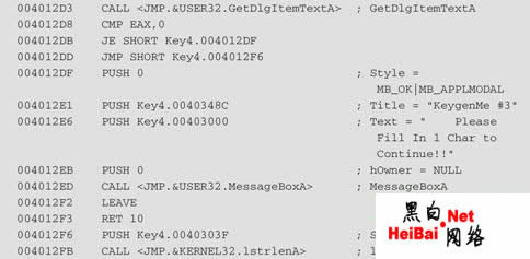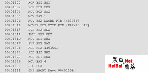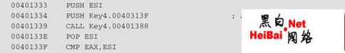 通過查看這段代碼,你可以明顯地看到好像有兩段代碼中包含了密鑰生成算法。第一段是列表11.1中Key4.0040130B部分,第二段是列表11.2給出的整個函數。列表11.1中的那部分代碼生成了ESI寄存器中的值,而列表11.2中的函數將返回值賦給了EAX寄存器。然后比較這兩個值,如果兩個值相等的話,程序就報告成功通過驗證(也就是我們剛才修補過的地方)。