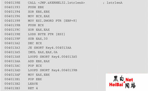 在調試器中單步調試這段代碼,我們會看到一些有經驗的逆向工作者僅通過觀察這個函數就可以獲得的一些信息。這個函數實際上就是把通過參數傳入的字符串轉化成一個二進制的DWORD(雙字),它相當于C運行庫中的atoi函數,但它看上去更像是一個atoi函數的個人實現版本(atoi要稍微復雜一點,如果有相應的庫文件,并且因為OllyDbg能夠識別出庫函數——如果程序中用了atoi函數的話,肯定會被OllyDbg識別出來,但OllyDbg沒有在KeygenMe-3中找到相關的任何信息)。