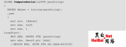 表11.3給出了我為密鑰生成程序創(chuàng)建的取出來的子程序。它實際上是一個C函數(用Microsoft的C/C 編譯器編譯),其中是一段從OllyDbg的反匯編器中拷貝而來的一段直接插入的(inline。譯注:用“_asm { }”括起來的部分)匯編代碼。用小寫字母表示的指令是我手工加上去的,還包括LoopStart這個名稱。