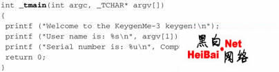 我把這個函數(函數名為ComputeSerial)插入到一個短小的控制臺模式的應用程序中(console mode application),這個程序要求用戶輸入用戶名,并以十進制數形式顯示ComputeSerial函數的返回值。這個程序所要做的只是調用ComputeSerial函數并以十進制數的形式顯示ComputeSerial的返回值。下面是我的密鑰生成程序的入口程序: