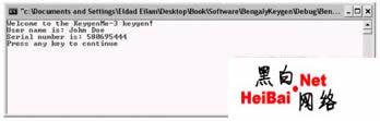 似乎輸入任意一個名字到KeygenMe-3主界面的上面的那個文本框(這個名字應與作為參數傳遞給ComputeSerial函數的名字相同),然后將ComputeSerial函數的返回值鍵入到KeygenMe-3主界面的第二個文本框,就可以讓KeygenMe-3顯示成功消息框了。讓我們來試試看。你可以將“John Doe”作為參數傳遞給我們的密鑰生成程序,并記下生成的序列號。圖11.9顯示了密鑰生成程序的輸出界面。