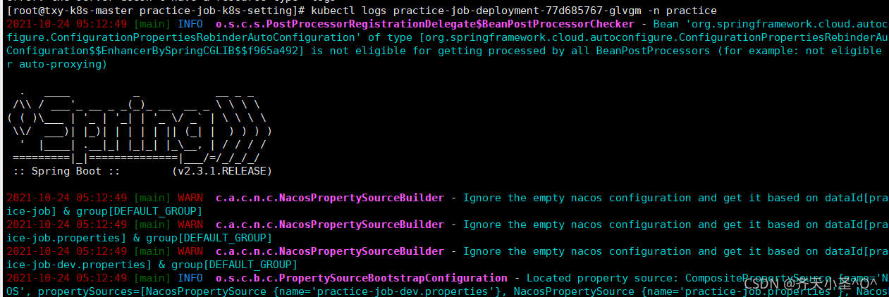 執(zhí)行命令:kubectl logs practice-job-deployment-77d685767-glvgm -n practice 查看應(yīng)用運行日志。格式為:kubectl logs <pod的name> -n <pod的namespace>。