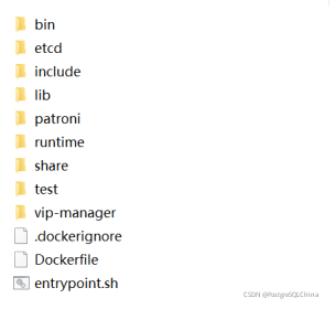 其中Dockerfile為鏡像主文件,docker服務(wù)通過該文件在本地倉庫創(chuàng)建鏡像;entrypoint.sh為容器入口文件,負責業(yè)務(wù)邏輯的處理;function為執(zhí)行業(yè)務(wù)方法的入口文件,負責啟動etcd,監(jiān)控etcd集群狀態(tài)、啟動patroni和vip-manager;generatefile為整個容器生成對應(yīng)的配置文件,包括etcd、patroni及vip-mananger。