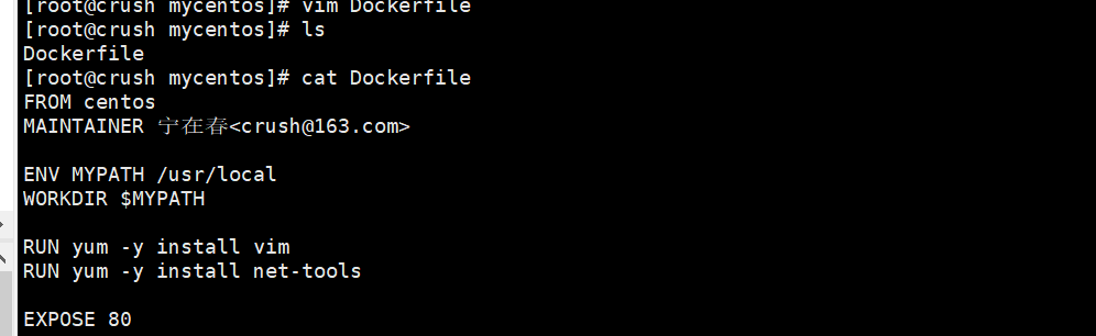 FROM centosMAINTAINER 寧在春<crush@163.com>ENV MYPATH /usr/localWORKDIR $MYPATHRUN yum -y install vimRUN yum -y install net-toolsEXPOSE 80 CMD echo $MYPATHCMD echo "success"CMD /bin/bash #只會(huì)運(yùn)行最后一個(gè)