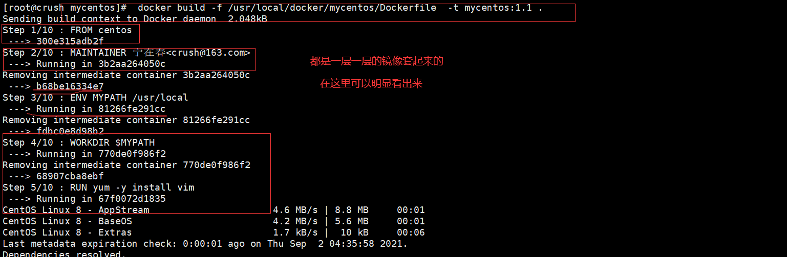 在這里也可以看出來(lái),鏡像它是由Dockerfile文件中的指令,一層一層構(gòu)建出來(lái)的。