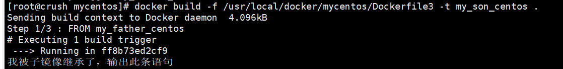 FROM my_father_centosRUN yum -y install curlCMD ["crul", "-s","http://ip.cn"] docker build -f /usr/local/docker/mycentos/Dockerfile3 -t my_son_centos .