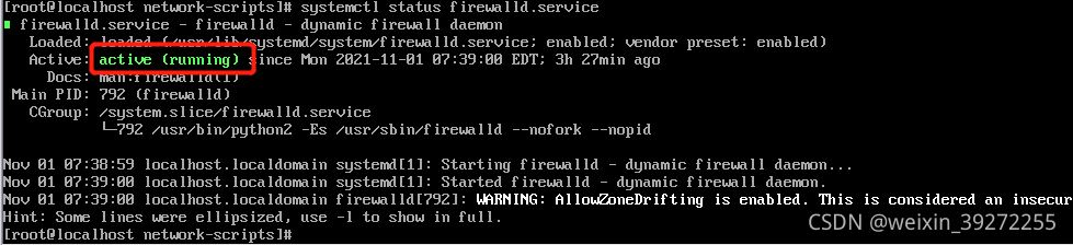 systemctl status firewalld.service查看防火墻狀態(tài)命令
