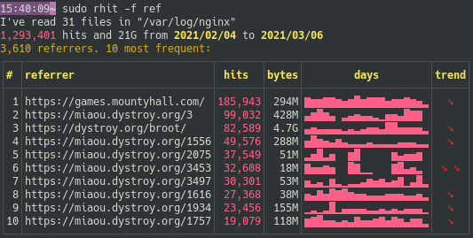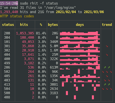 Rhit 可以從標(biāo)準(zhǔn)文件夾中讀取 Nginx 的日志文件(gzipped 的壓縮文件也可以),并進(jìn)行分析統(tǒng)計(jì),在控制臺中以可視化的表格形式展示,并且不會產(chǎn)生任何多余的臨時(shí)文件或數(shù)據(jù)。