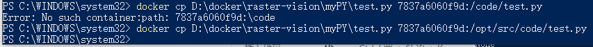docker cp [本地路徑] 容器id:[容器內(nèi)路徑] docker cp D:\docker\raster-vision\myPY\test.py 7837a6060f9d:/opt/src/code/test.py docker cp 容器id:[容器內(nèi)路徑] [本地路徑]