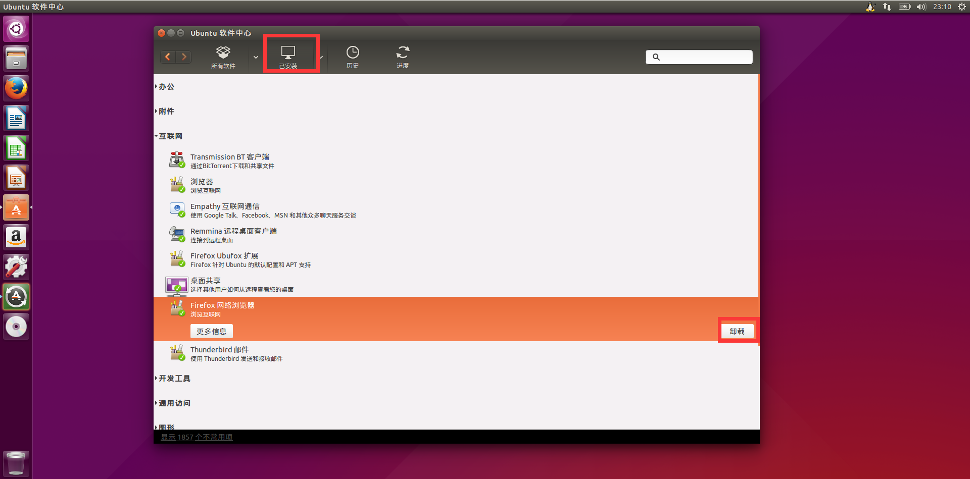 點擊已安裝可以查看安裝在本機的軟件包,并且可以在此管理它們,如圖選中 Firefox 并點擊卸載,此時會提示你輸入密碼,輸入完成且正確就會卸載你所選的程序。