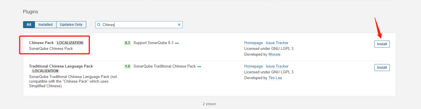 SonarQube提供了強大的插件管理功能,以中文語言包為示例,講解如何安裝插件: