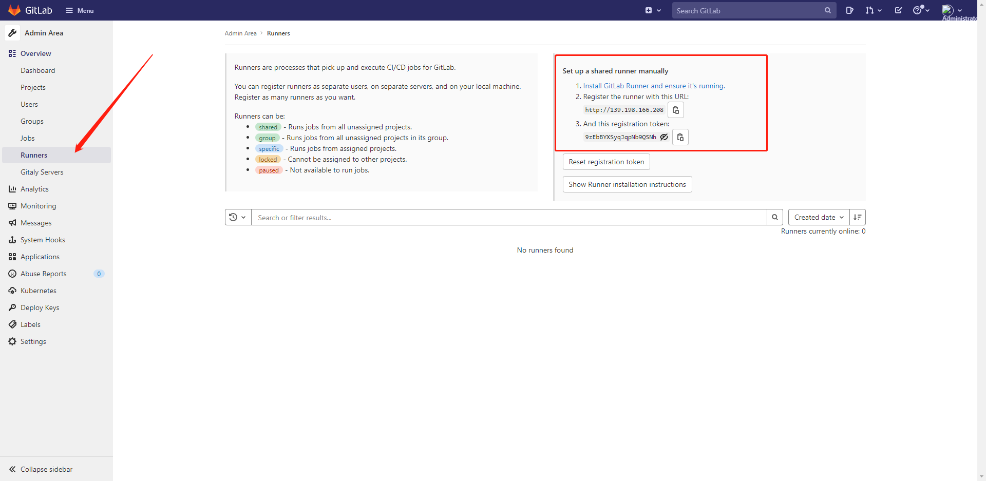 再次加載gitlab頁面,出現(xiàn)runner配置項。