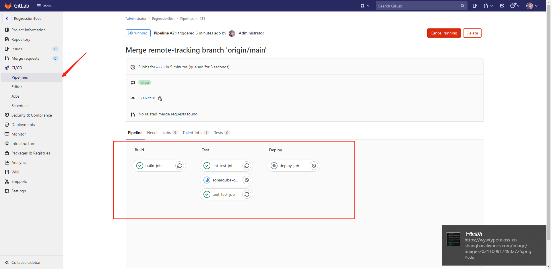 提交代碼后gitlab會自動進(jìn)行CI/CD: