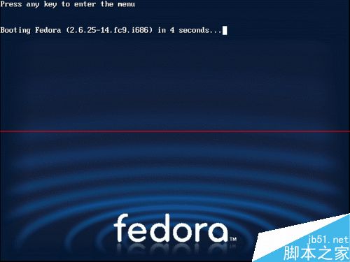 1、首先,我們需要進(jìn)入Fedora GRUB操作系統(tǒng)引導(dǎo)界面,一般安裝時(shí),默認(rèn)是不顯示操作系統(tǒng)選項(xiàng),經(jīng)幾秒后就直接啟動(dòng)操作系統(tǒng)的,因此,我們需要在系統(tǒng)啟動(dòng)的時(shí)候,使用任意鍵進(jìn)入啟動(dòng)菜單項(xiàng),如下圖所示。
