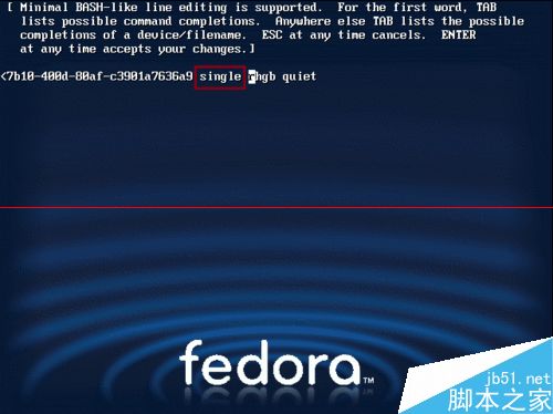 4、進(jìn)入編輯界面之后,使用左右鍵將光標(biāo)轉(zhuǎn)到“rhgb quiet”之類(lèi)的字符前面,輸入“single”加空格,或者輸入“1”加空格,完成之后按回車(chē)鍵,就可以,返回上一步中啟動(dòng)命令行菜單。