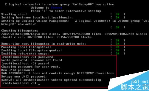 5、返回命令行啟動(dòng)菜單之后,按“b”鍵,就可以以單用戶(hù)模式啟動(dòng)操作系統(tǒng)了。操作系統(tǒng)啟動(dòng)之后,會(huì)直接進(jìn)入單用戶(hù)模式,不需要再輸入任何登錄密碼。這時(shí)我們就可以使用“passwd”命令重新設(shè)置root密碼了。