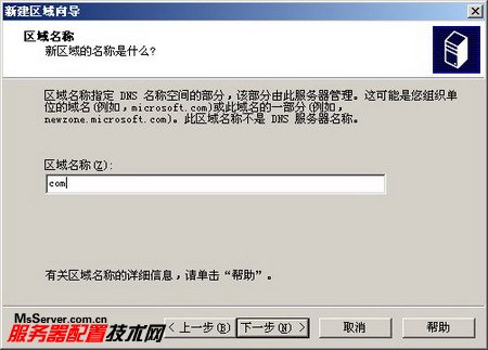 第2步,在“區(qū)域類型”選項卡中保持默認(rèn)選項“主要區(qū)域”的選中狀態(tài),單擊“下一步”按鈕。接著在“區(qū)域名稱”選項卡中輸入合適的區(qū)域名稱,如COM。依次單擊“下一步”→“完成”按鈕完成設(shè)置,如圖2008121201所示。