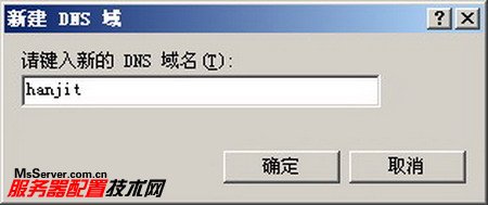 第3步,展開并選中剛才新建的COM區(qū)域,在打開的快捷菜單中執(zhí)行“新建域”命令,打開“新建DNS域”對話框。在該對話框中輸入一個合適的域名,如hanjit,并單擊“確定”按鈕,如圖2008121202所示。