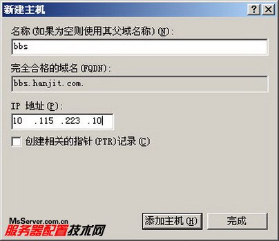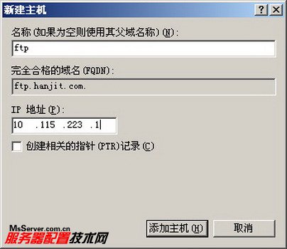 第4步,依次展開com區(qū)域→hanjit域,右鍵單擊hanjit域,在打開的快捷菜單中執(zhí)行“新建主機”命令,打開“新建主機”對話框。在“名稱”編輯框中輸入一個能反映該域名主要用途的主機名稱,如FTP。在“IP地址”編輯框輸入FTP服務(wù)器綁定的IP地址,如10.115.223.1,并依次單擊“添加主機/確定”按鈕,如圖2008121203所示。
