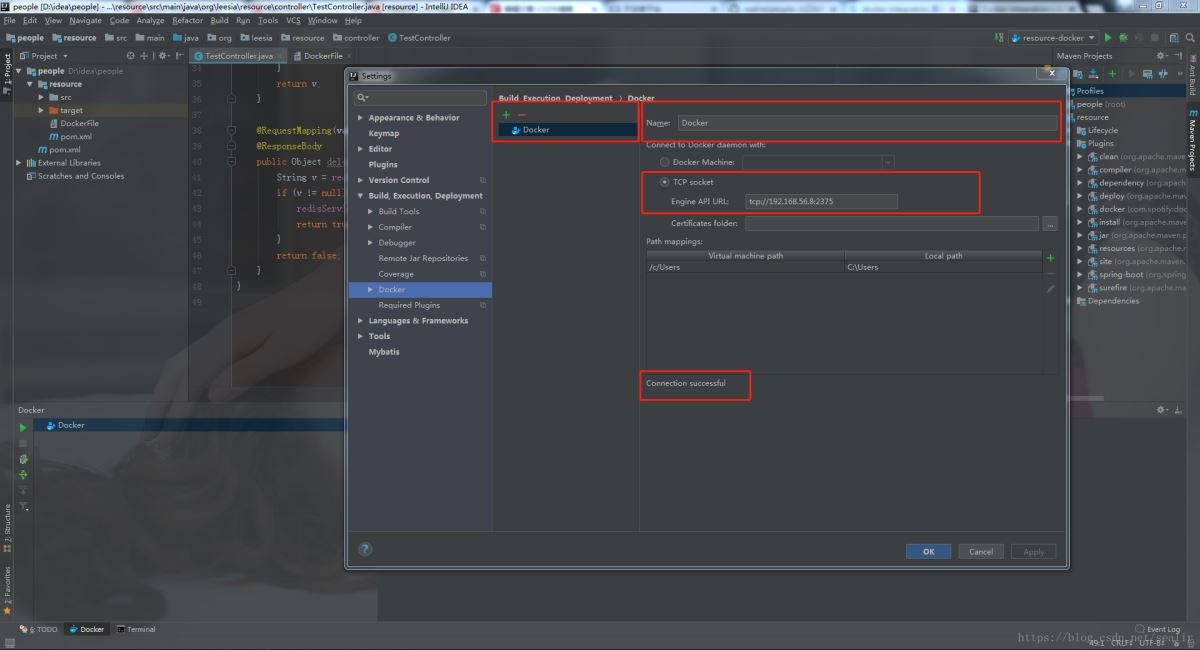 重啟后配置docker,連接到遠(yuǎn)程docker服務(wù)。從File->Settings->Build,Execution,Deployment->Docker打開(kāi)配置界面。
