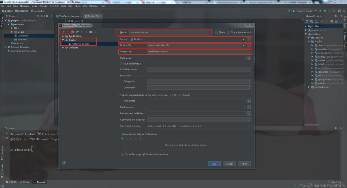 點(diǎn)擊Docker,再點(diǎn)擊+號(hào),添加一個(gè)docker命令,輸入Name,選擇Server,選擇Dockerfile文件,輸入鏡像tag,完成配置。